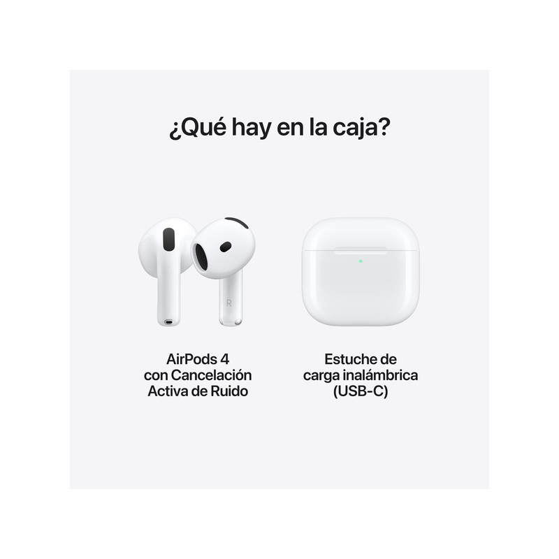 CANCELACIÓN ACTIVA DE RUIDO Los AirPods 4 con Cancelación Activa de Ruido reducen el ruido ambiental antes de que llegue a tus oídos, para que te sumerjas por completo en lo que estás escuchando