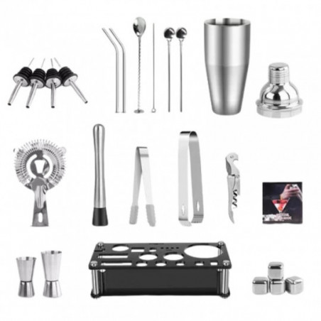 El juego completo de 23 piezas de coctelera incluye coctelera de 750 ml / cubitos de hielo de acero inoxidable / paleta triturada / taza medidora / clip para hielo / sacacorchos / vertedor de licor / pajita / colador / tapones / cepillo / cuchara / mezcla Cuchara: Crea cócteles de licor de nivel profesional con confianza, sin importar si eres un bartender experimentado o un principiante.