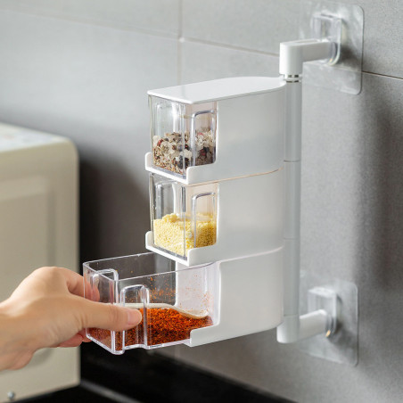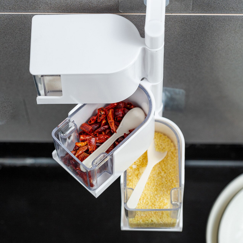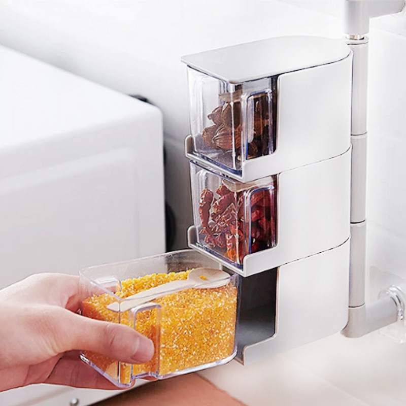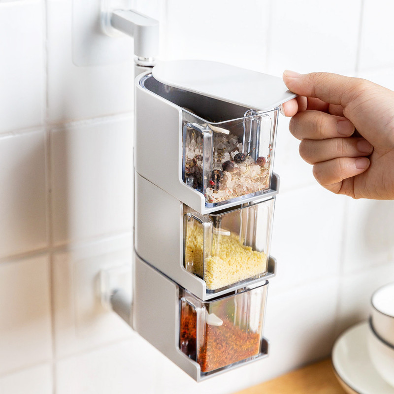 La botella transparente te permite ver el interior para que puedas conseguir fácilmente la correcta. Un juego de 3 cajas para almacenar diferentes especias. Cada caja está equipada con una cuchara más conveniente. Las cajas desmontables se pueden sacar para una limpieza fácil.