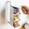 Diseño montado en la pared: la caja de condimentos es un almacenamiento montado en la pared, sin clavos ni perforaciones, sin daños en la pared, ahorrando espacio en la cocina, fuerte capacidad de absorción y carga, adherencia fuerte y la caja de condimentos no se caerá fácilmente.