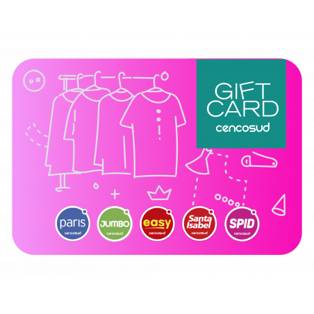 Válida por 6 meses desde la fecha de emisión. Úsala en Paris, Jumbo, Spid, Santa Isabel, Easy, Women'secret, Umbrale, American Eagle y también en www.paris.cl a excepción de productos que pertenezcan a Market Place. El envío de la Gift Card será a través de correo electrónico dentro de un plazo máximo de 48 horas hábiles posterior a la compra y no tiene costo. Gift Card Nominativa. No es canjeable por dinero en efectivo ni válida para el pago de cuentas, contratación de seguros u otros servicios financieros. Válida sobre precios vigentes en el local, exceptuando ofertas y/o promociones exclusivas con Tarjeta Cencosud y eventos promocionales. El robo o extravío es de responsabilidad exclusiva del portador. El documento de respaldo de esta compra será un Comprobante de Recaudación, el cual no podrá ser reemplazado por una Boleta o Factura. Reglamento de uso publicado en www.giftcard.cl
