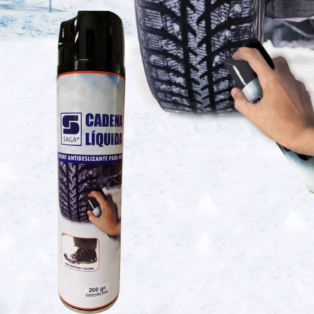 Cadena líquida para hielo y nieve, ideal para ser utilizada en zonas con presencia de hielo o nieve. El producto es de fácil aplicación. Su formato en aerosol, permite dar la confianza necesaria para asegurar el desplazamiento seguro sobre superficies con hielo o nieve.