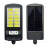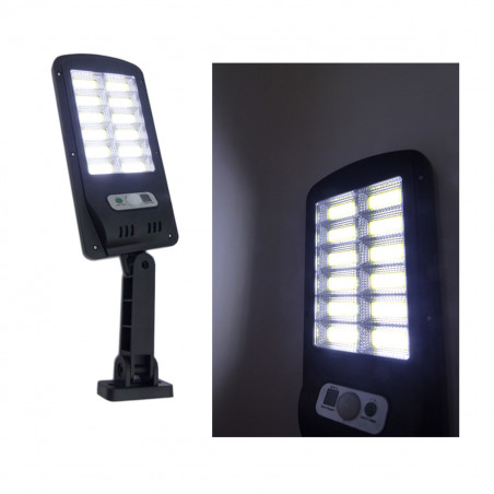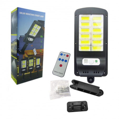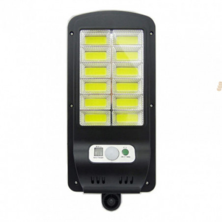 Foco solar de 12 Placas LED COB, ideal para instalar en muros de patio, jardín, Calle, etc. Se recarga por medio de luz solar, cuenta con sensor de movimiento, puedes controlar sus funciones de luz por medio de su control remoto.