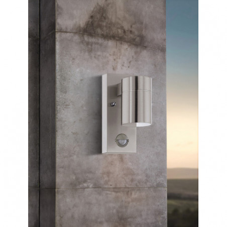 El aplique de exterior LED RIGA 5 está fabricado con un cuerpo cilíndrico de acero inoxidable con una cubierta de cristal transparente. La fuente de luz LED GU10 suministrada proporciona una agradable luz blanca cálida. La lámpara de pared está equipada con un sensor de movimiento y enciende la luz automáticamente, las áreas que son difíciles de ver se iluminan y se disuade a los invitados no invitados. La lámpara de exterior es apta para su uso en exteriores sin dudarlo gracias a su protección contra salpicaduras de agua (IP44). Gracias a la luz empotrada de diseño moderno, la luz con sensor encaja en casi cualquier área exterior y ofrece una iluminación indirecta y elegante en la pared de la casa.