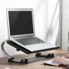 • Este elevador de calidad es la configuración más fácil para elevar su monitor/portátil a una posición de lectura ergonómicamente adecuada mientras proporciona un espacio de trabajo adicional y un área de almacenamiento aumentada para un espacio de trabajo libre de desorden.