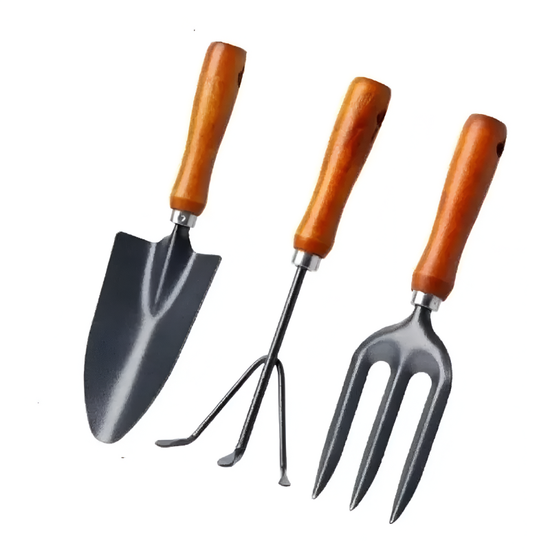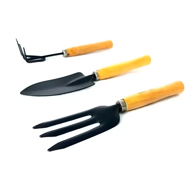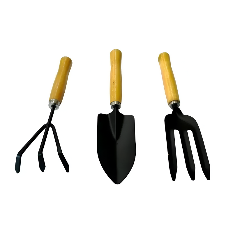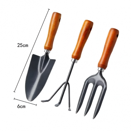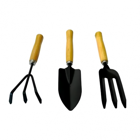 Práctico set de herramientas para jardín o huertas, que incluye pala, rastrillo y tridente, fabricado en acero y mango plástico.