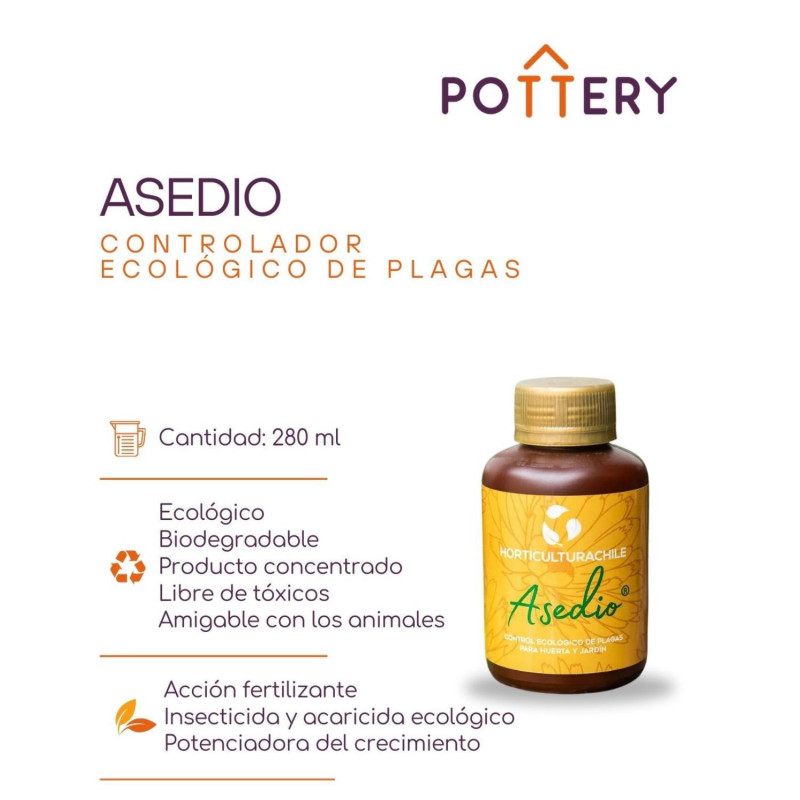 Recomendado para control de plagas más comunes en plantas, huertos y jardines de Chile: mosca blanca, pulgones, chanchito blanco, conchuelas, arañita roja, mosquito del sustrato, larvas minadoras y escamas, entre otros insectos plaga. Asedio posee doble acción, ya que actúa por contacto y de forma sistémica, inhibiendo los procesos evolutivos de los insectos.Además Asedio ha demostrado ser muy eficaz en control de CHINCHE DEL ARCE. Además posee acción fertilizante y potenciadora del crecimiento en plantas y hortalizas, devolviéndoles su vigor.