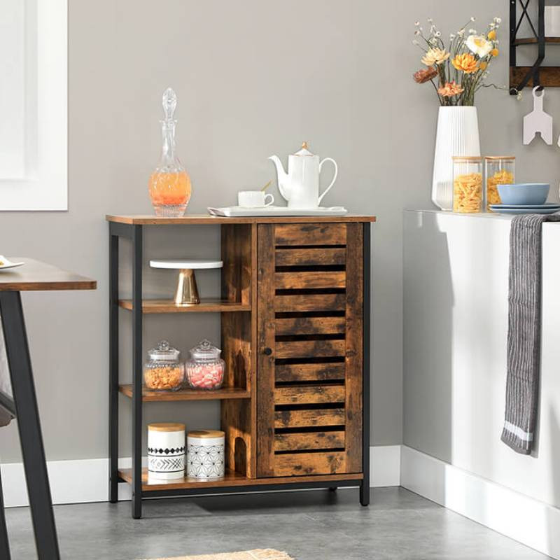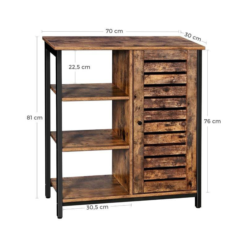 Para todos aquellos que no pueden decidir entre el armario de la sala de estar y el estante del pasillo o el diseño rústico e industrial, este armario de almacenamiento multifuncional con 3 estantes abiertos y 2 ocultos es la elección perfecta. Este estante de pie tiene un armario integrado cuya elegante puerta de persiana se abre mágicamente con una simple presión de la puerta. Detrás, 2 estantes ajustables en altura ofrecen mucho espacio de almacenamiento para todos sus secretos. La combinación robusta de acero resistente y madera de ingeniería resistente le da al gabinete un alto grado de estabilidad; cargue la superficie superior con artículos de hasta 30 Kg. Use el gabinete de almacenamiento de 70 x 30 x 81 cm no solo como un armario para la sala de estar, sino que también colóquelo en su estudio o dormitorio para equipar su hogar con plantas verdes y marcos de fotos. O, ¿qué tal un poco más de espacio de almacenamiento en la cocina?