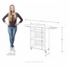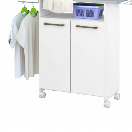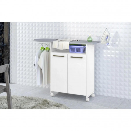 Entre las características que distinguen a este modelo, hay que destacar su tono blanco, perfecto para que se acople a los colores que tengas en la cocina. Está fabricado en MDF (estructura). Cuenta tabla para planchado, espacio amplio para almacenar ropa y un soporte metálico para dejar plancha.