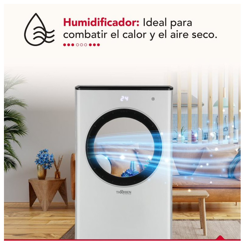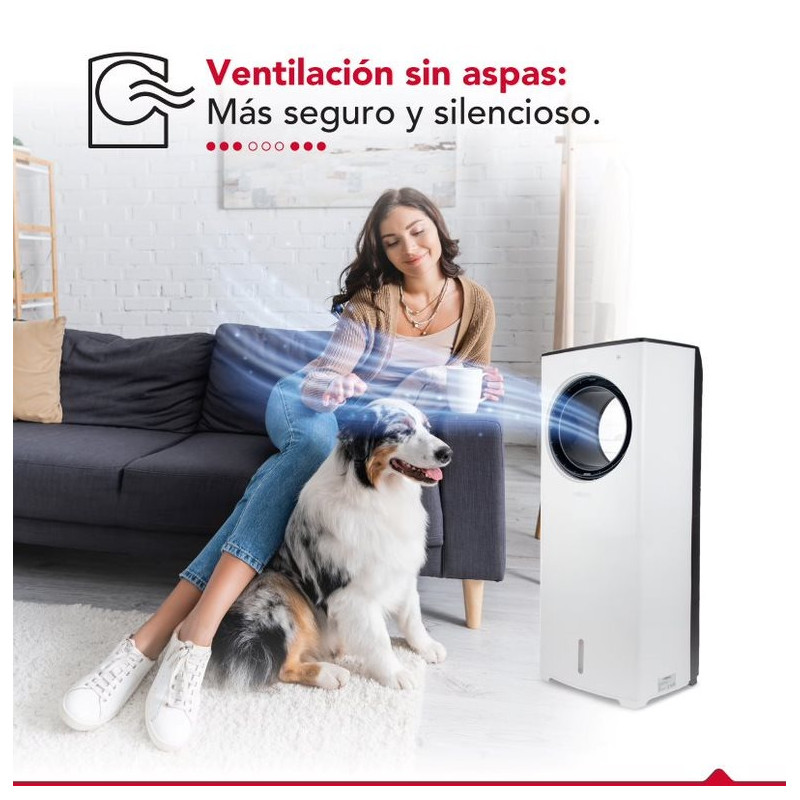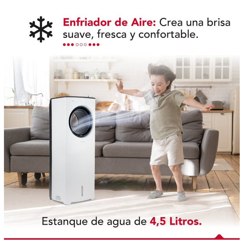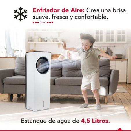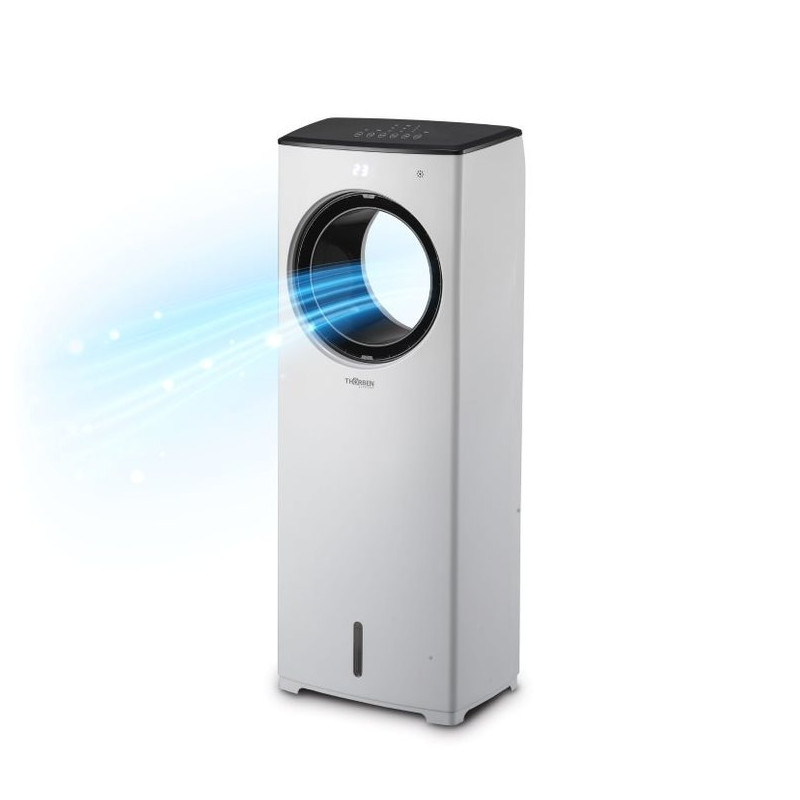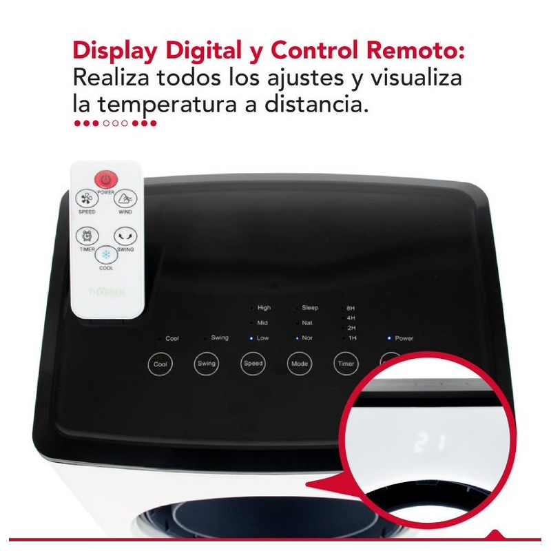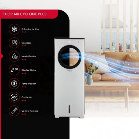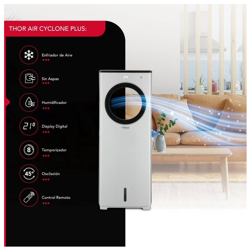 El enfriador de aire sin aspas Thor Air Cyclone plus es un dispositivo innovador que te brinda frescor y confort. Su diseño aerodinámico y sin aspas lo hace seguro, silencioso y fácil de limpiar. Genera un flujo de aire potente y uniforme además de poseer una función de oscilación automática que lo distribuye por toda la habitación. Su panel digital te permite controlar la temperatura, la velocidad y el modo de viento: natural, normal y nocturno. Tiene control remoto y temporizador de 8 horas. Su estanque de 4.5 lts te da una autonomía prolongada y su eficiencia energética te ahorra luz. Disfruta de un ambiente agradable y saludable con el Thor Air Cyclone plus, el mejor aliado contra el calor.