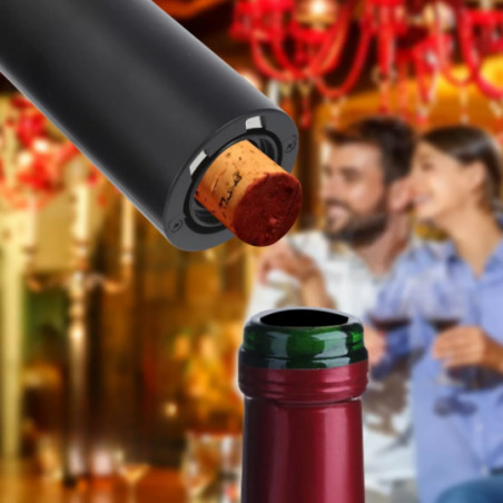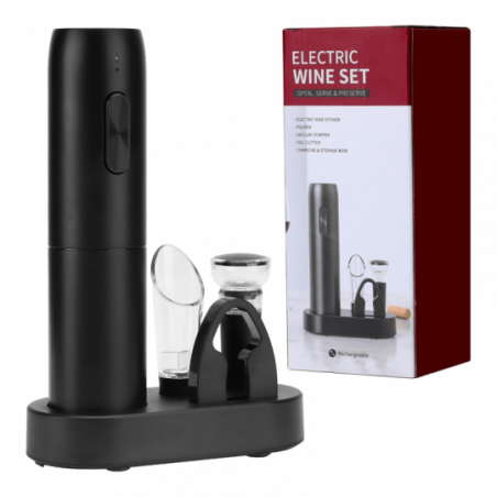 El sacacorchos eléctrico elimina el esfuerzo de abrir botellas de vino. Con solo tocar un botón, podrás disfrutar de tu vino favorito en segundos. Este no es solo un sacacorchos de vino. También contiene un aireador de vino, sacador de aire de vino, cortapapel y base para almacenar todos los accesorios. Disfruta de una experiencia alrededor del vino sin igual.