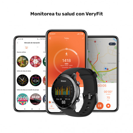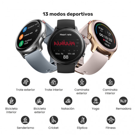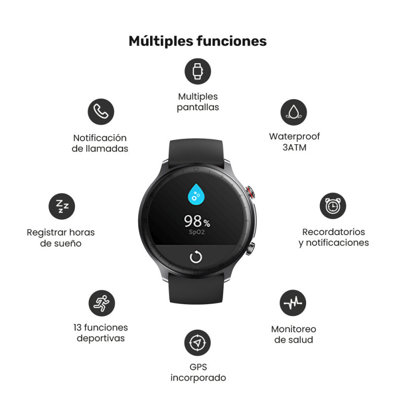 Funciones: • Monitoreo de oxigeno en la sangre, frecuencia cardiaca, niveles de estrés y sueño. • Monitoreo de pasos, calorías y distancia. • Reconocimiento de movimiento automático. • GPS incluido • Monitoreo de pasos, calorías y distancia. • 13 modos deportivos: trote interior y exterior, caminata interior y exterior, bicicleta interior y exterior, cricket, senderismo, natación, yoga, remadora, elíptica, fitness. • Notificación de llamada entrante • Notificaciones de Apps • Salud de la mujer • Recordatorio de sedentarismo • Clima • Cronómetro, temporizador y control de música
