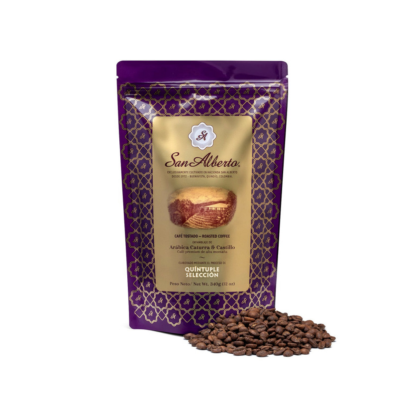 Cafe San Alberto 340 gr: Un café con gratas notas aromáticas dulces, afrutadas, que recuerdan el caramelo y el suave chocolate oscuro; sobresale su delicada acidez frutal, su elegante cuerpo cremoso y su armonioso balance. 100% cultivado en la hacienda san Alberto y procesado bajo el proceso insignia de la Quíntuple Selección.